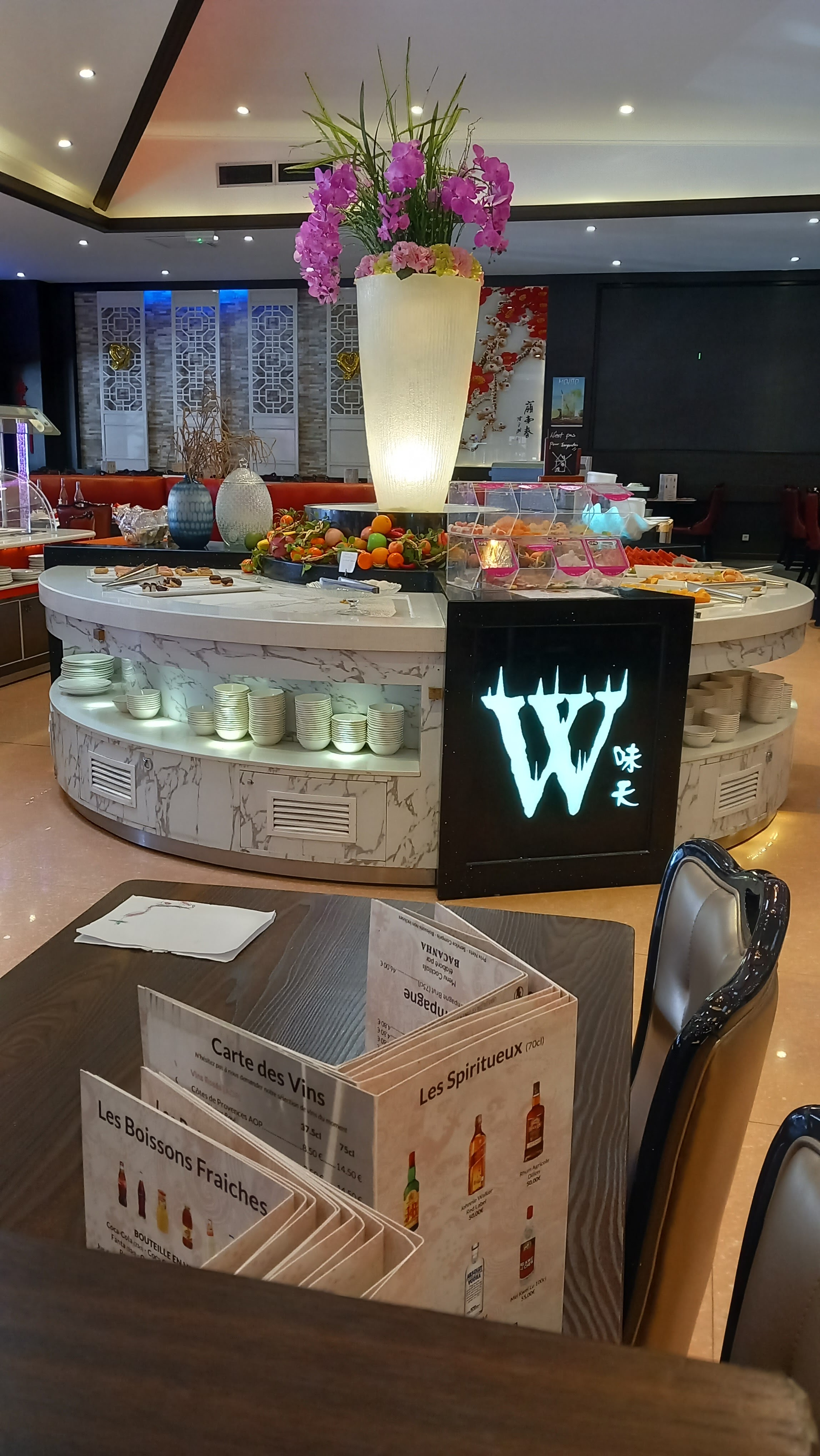 Notée en 2019 3* retrouvée dernièrement ; je reste sur cette note on augmentait les prix, alors qu' ils ont réduit le buffet ; pour ajouter des tables ! Je n' ose imaginer le bruit les vendredis soirs et week-end ! Certes, il reste quand même un grand choix Nous sommes arrivés tôt, à 21h 30 on ne s' entendait plus ! Mes amies ont pris de la mangue excellente, quand j' y suis allée : infecte ! Quant un restaurant se dit halal, il serait bon de ne pas mettre de porc ! De ce fait, je ne prends pas de viande. Plasser du japonais à mon goût est trop près du wok (froid/chaud) Les bols sont loin des sauces et des soupes, idem pour la menthe et la salade loin des nems. ! ? Une organisation pas logique ! Acceuil sympathique, débarrasse rapidement les assiettes Toilettes propres